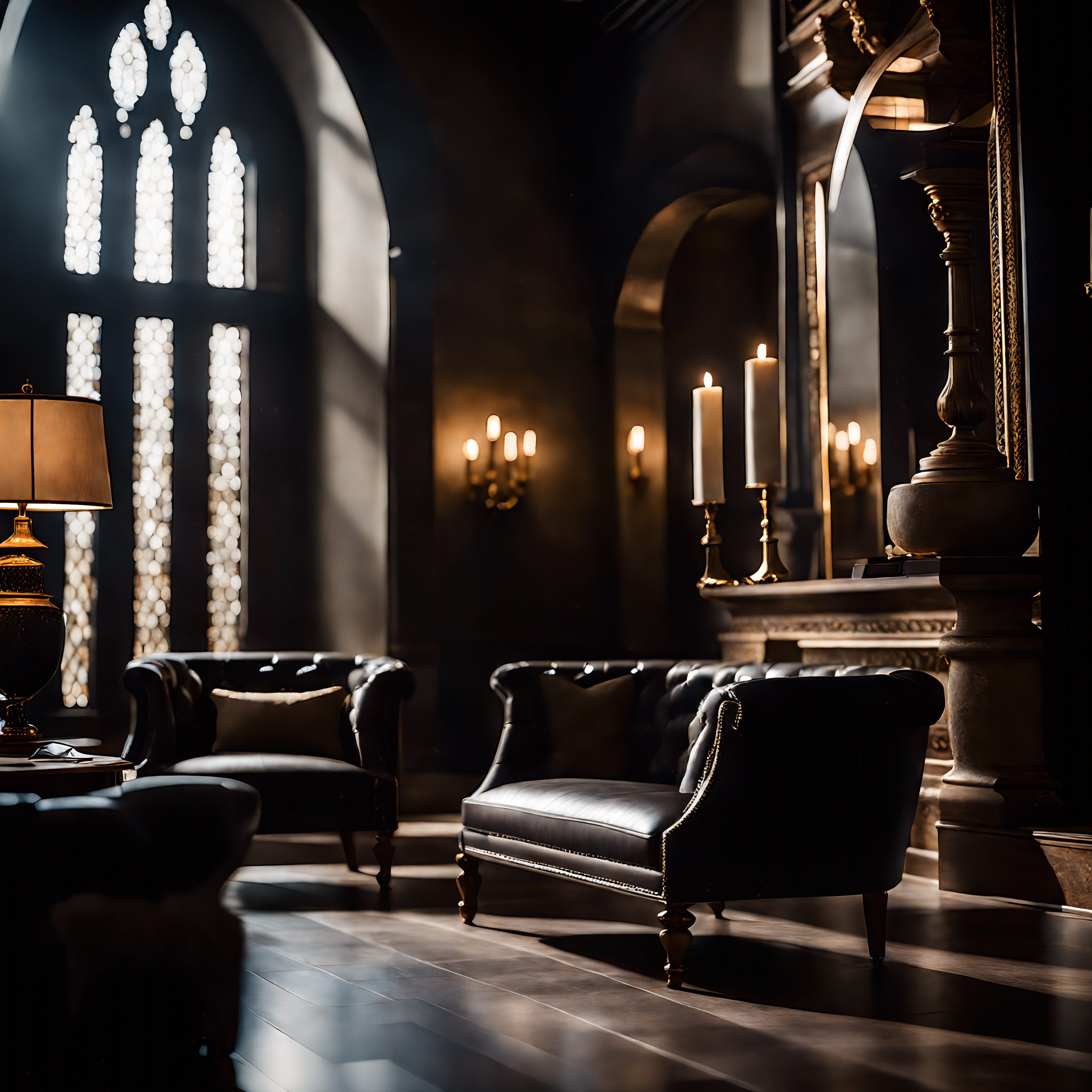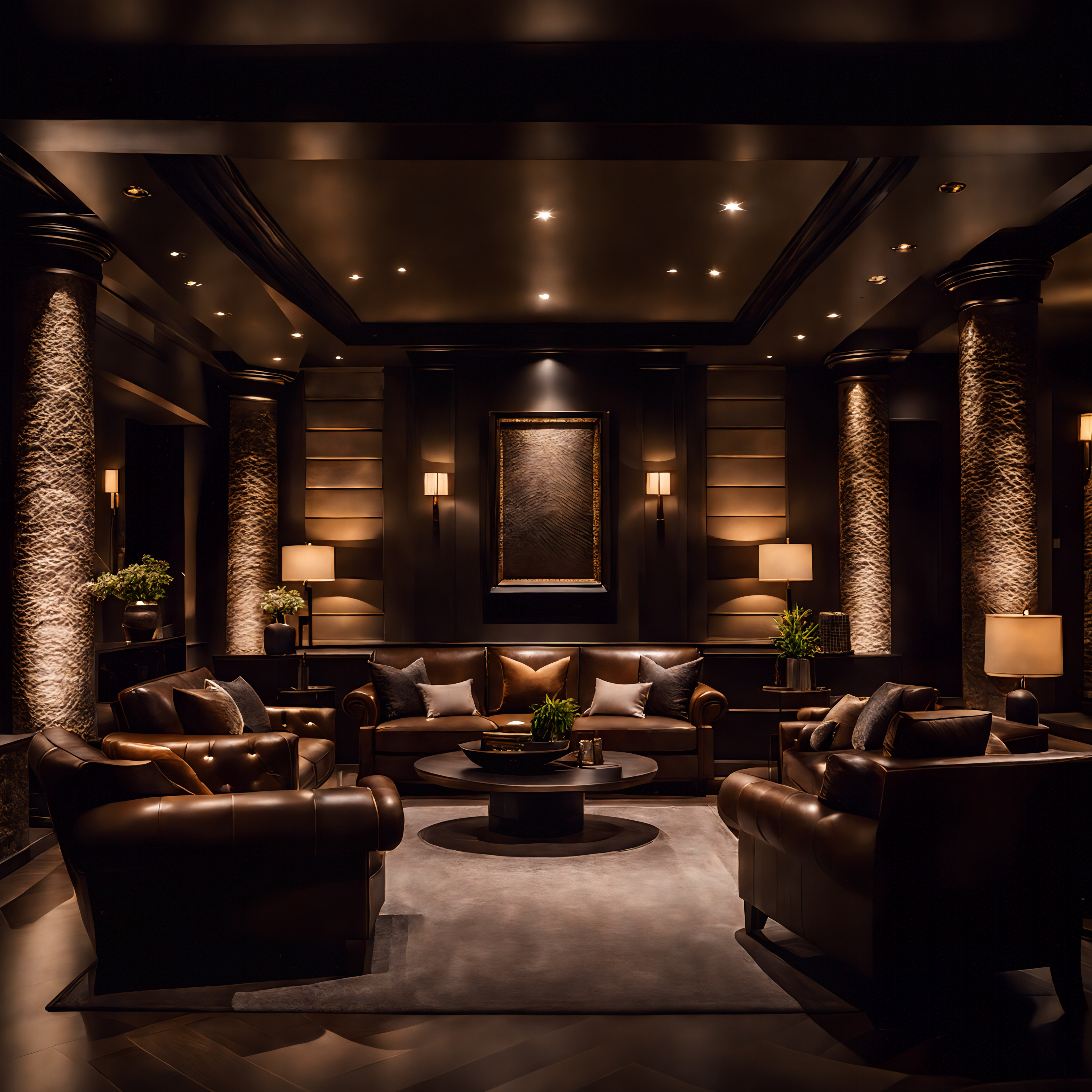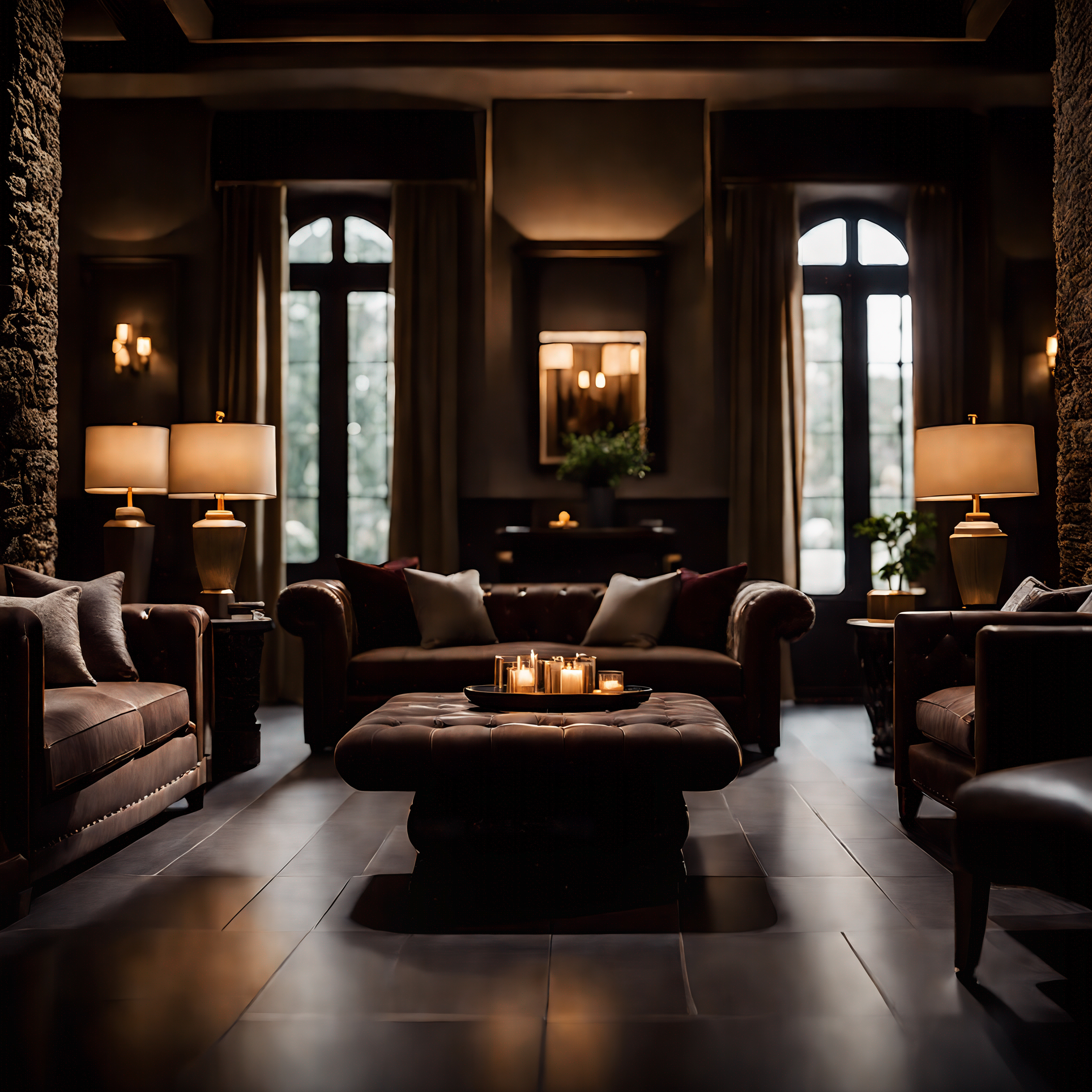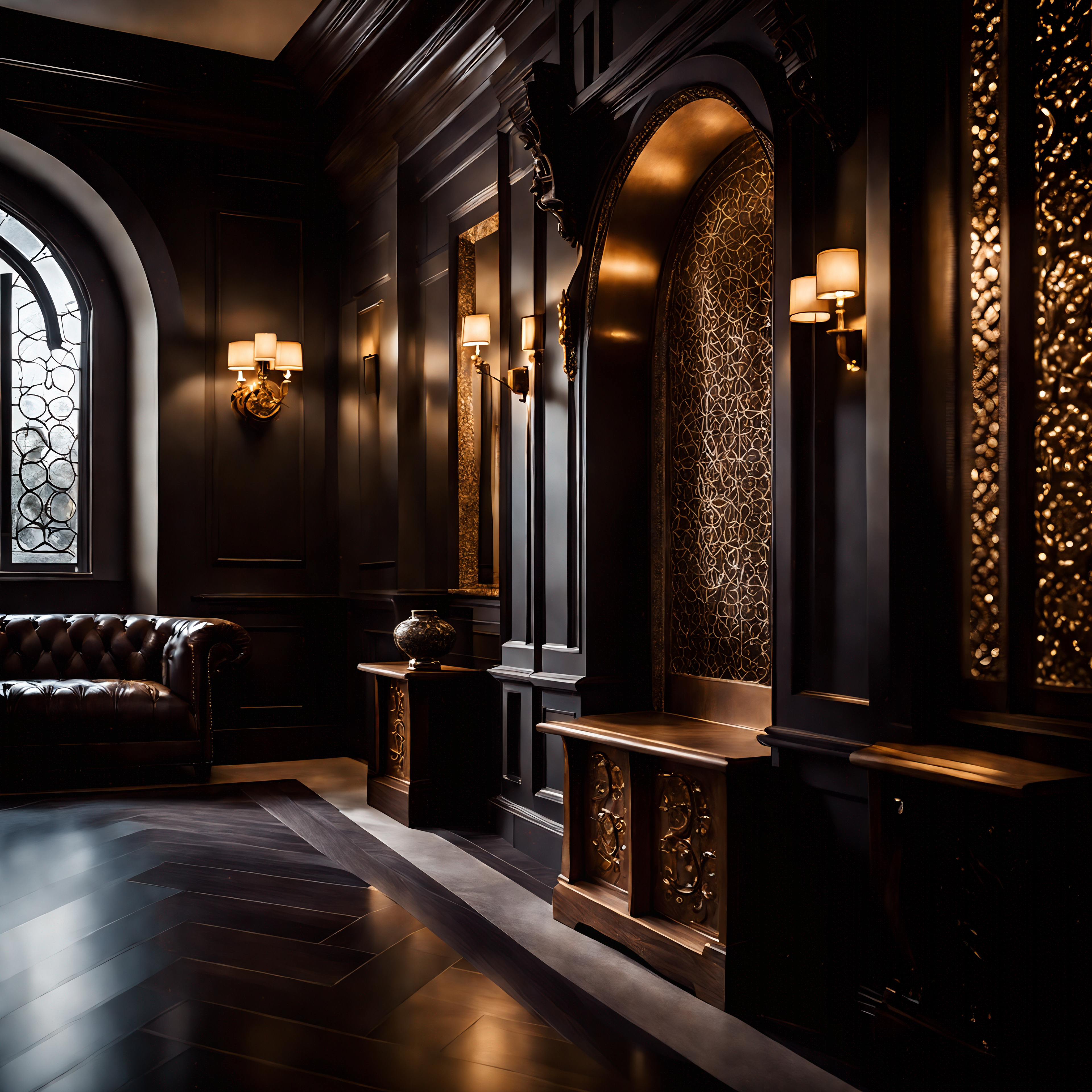 A proounced overture of treated american leather, flawless and drawn to an extension to coax reflextions from its surface blends seamlessly through imported African Blackwood, treated and stained to an smoothered ash culminating in natural repose against the organically formed rock fuxtures and wall fronts that bring this act of modern rustic Victorian luxury to a genuine culmination in form.