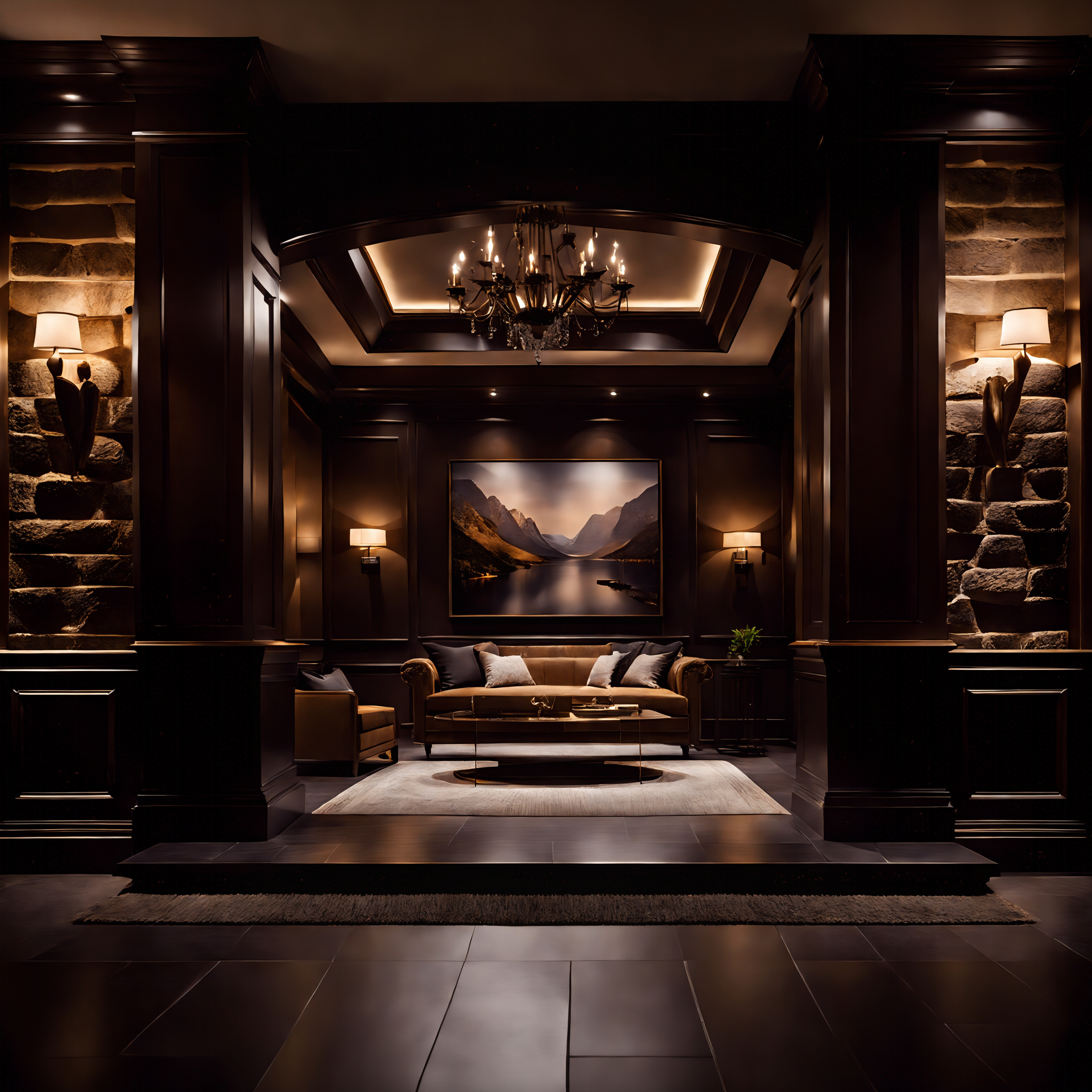 RUSTIC MODERN LOUNGE WITH AREA RUG OVER HARDWOOD FLOORS, TREATED AFTRICAN BLACKWOOD, TWIN CHANDELIERS, MARBLE FIXTURE, PALADIN ARCED WINOWS FOR NATURAL LIGHT WITH SCONCE TO COMPLIMENT. TASTEFULLY TONED IN NATURAL DEEP SHADE WOODED AND EARTHY TONES.
