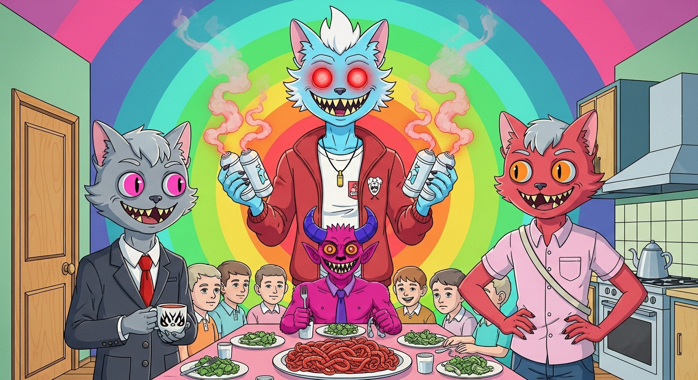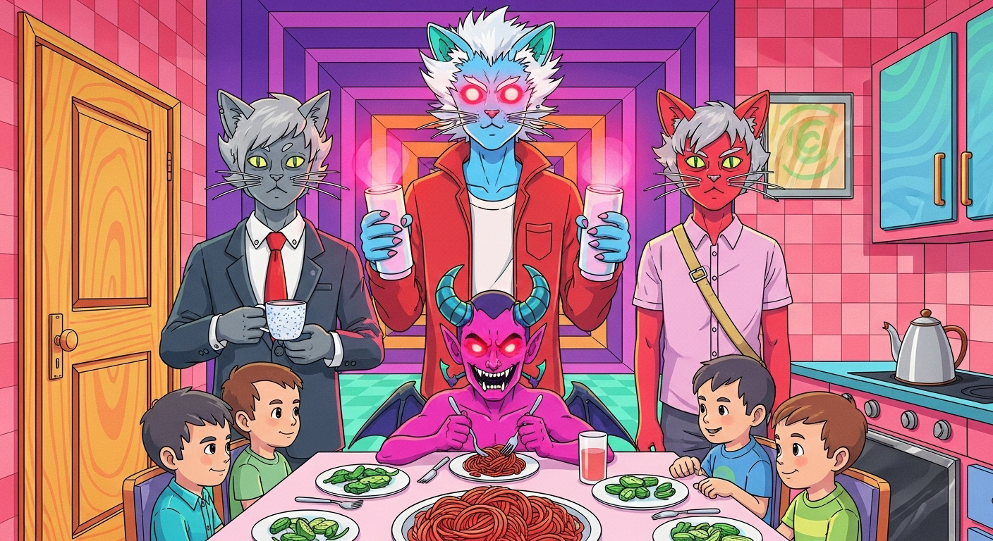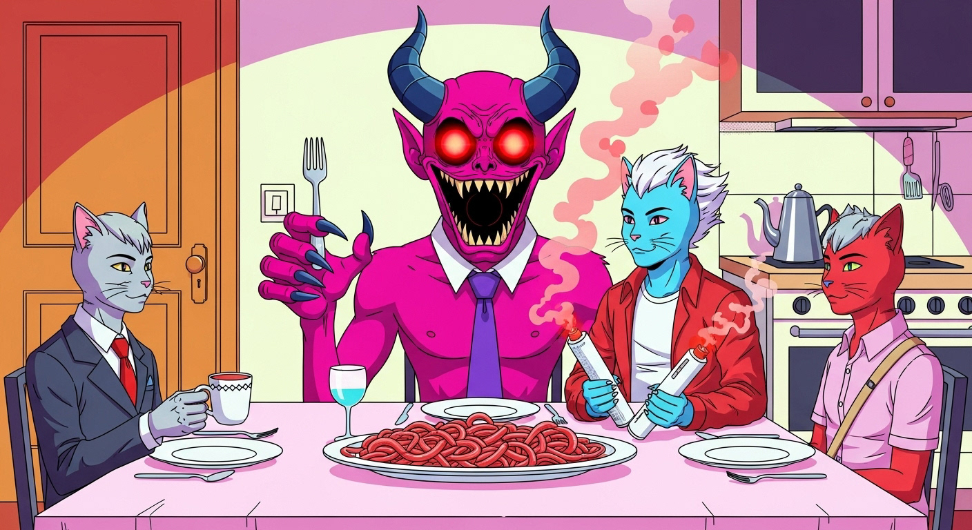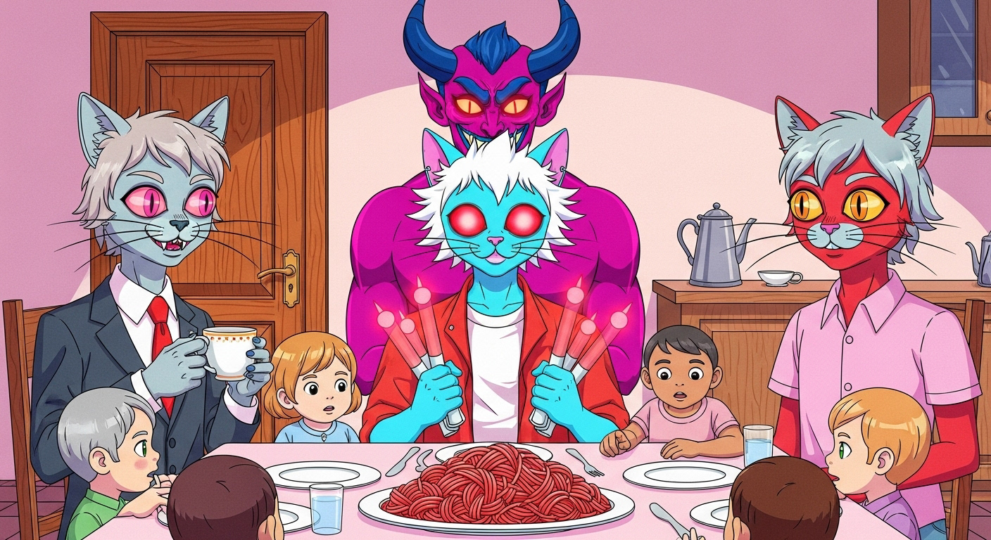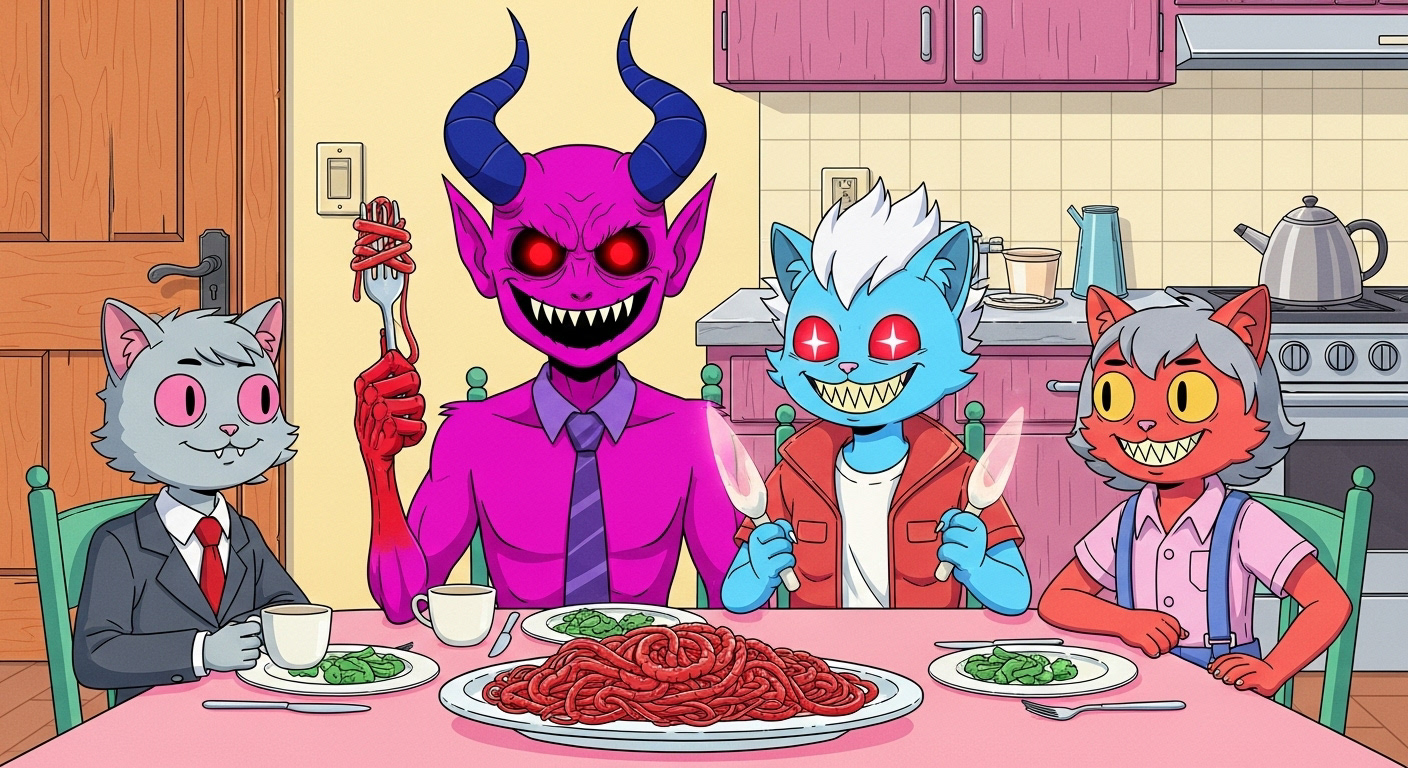 The demon is lured out of his lair deep in Hell's pit by the promise of a lovely spaghetti dinner at the fine company of a group of overly congenial school children. All very serious and not at all enjoyable.