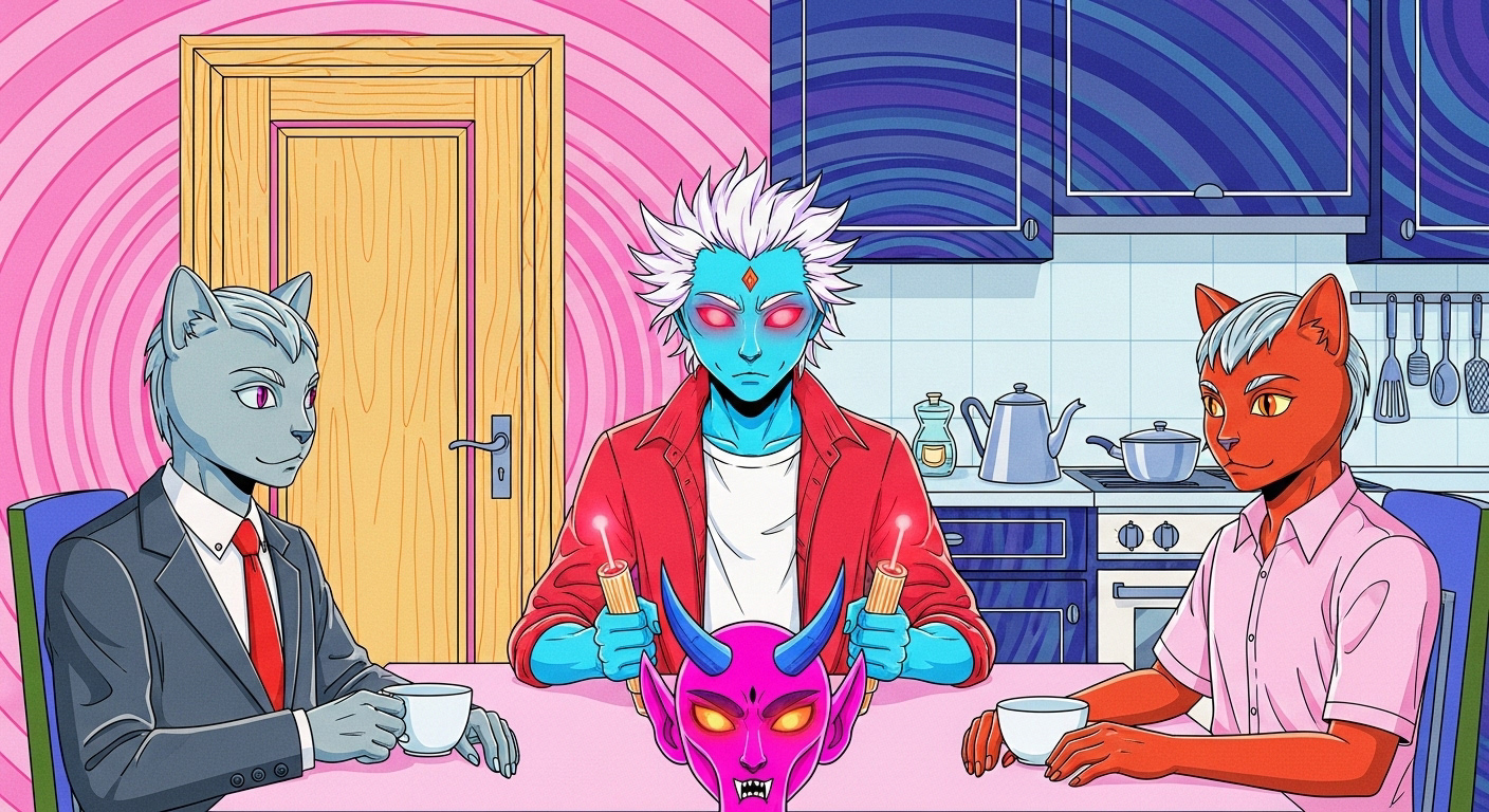 The three young men, cool little kids at heart, sit down at the dinner table to conjour a demon from a purple mask they found earlier that day while antiquing in China Town.